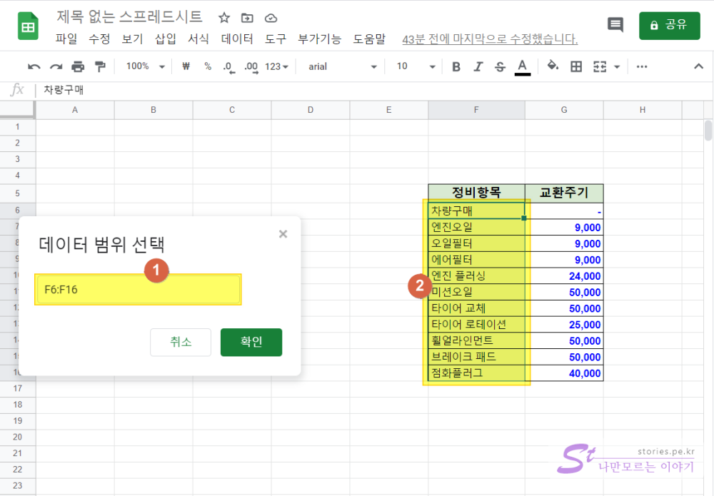 위와 같이 정비항목에 대해서 셀을 선택하는 방법입니다.