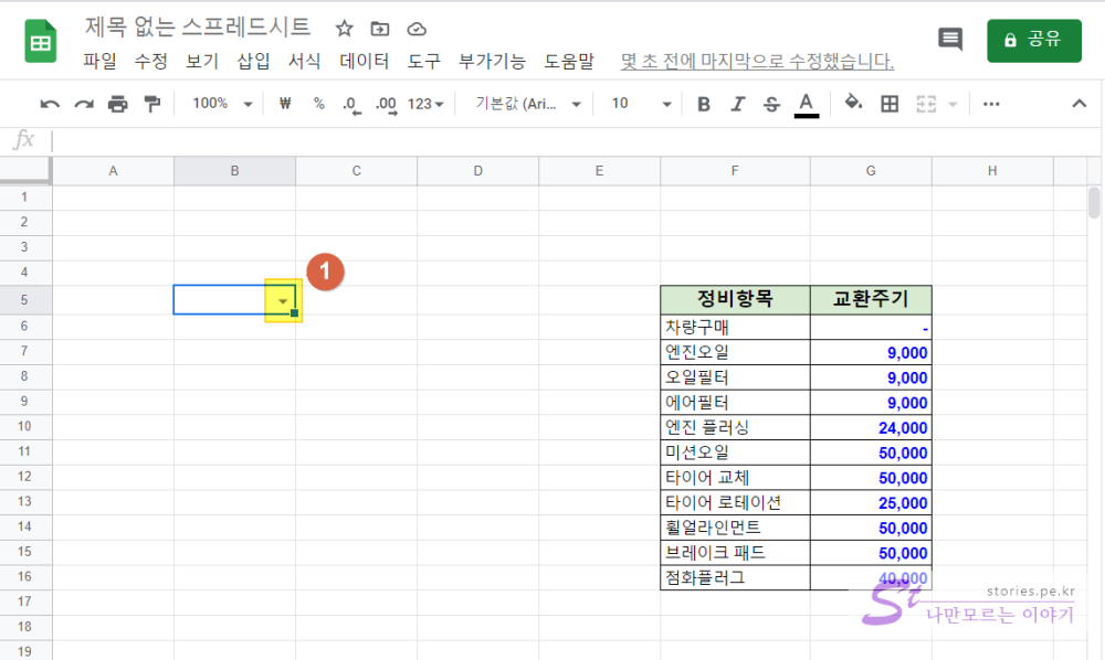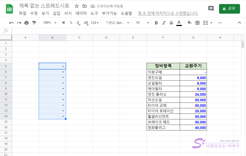 - 목록으로 삼고자하는 정비 항목을 클릭드래그해서 다중 선택을 하면 자동으로 1번에 내용이 입력됩니다.