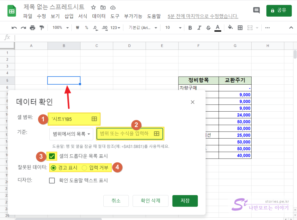 - 콤보박스의 항목과 다른 값을 셀에 입력했을 때 경고로 표시할지 입력이 되지 않게 할지를 선택합니다.