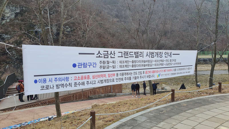 겨울이라고는 하지만 날씨가 춥지않은 12월 초에 다녀왔습니다. 서울 강북 기준으로 1시간 ~ 1시간 30분 정도 거리에 있기 때문에 부담없이 다녀올 수 있는 관광지 입니다. 방송에 소개는 되었으나 아직(21년 12월 기준) 관광지가 모두 완공 것이 아니라서 전망대까지는 갈 수 없어 조금 아쉽지만 그래도 소금산 출렁다리와 스카이워크, 데크 산책로 정도의 산행은 가능합니다.