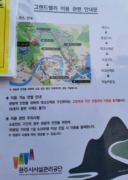 매표를 하면 팔에 찰 수 있는 입장권과 원주에서 사용할 수 있는 원주사랑상품권(2000원권)을 줍니다. 입장료가 3,000원이고 상품권으로 2,000원을 돌려주는 식이니 실제 입장료는 1,000원이라고 보시면 될것 같습니다. 원주사랑상품권은 꼭 원주에서만 사용해야 하므로 가능한 여행 중에 사용해야 합니다. 상품권은 간현관광지에서 쓰고 나오시는 분들이 대부분이더라구요.