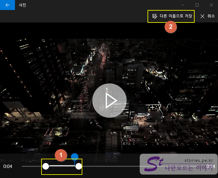 - 상단에 있는 다른 이름으로 저장을 선택하면 해당 구간이 별도의 동영상 파일로 저장이 됩니다.