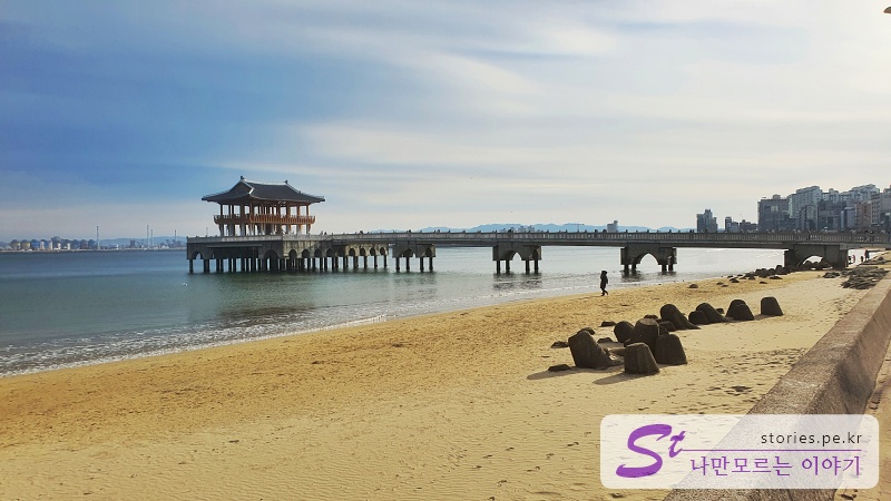 환호공원에서 내려다보이는 영일대 해수욕장입니다. 바다로 길게 뻗어있는 영일교가 눈에 띄네요.
