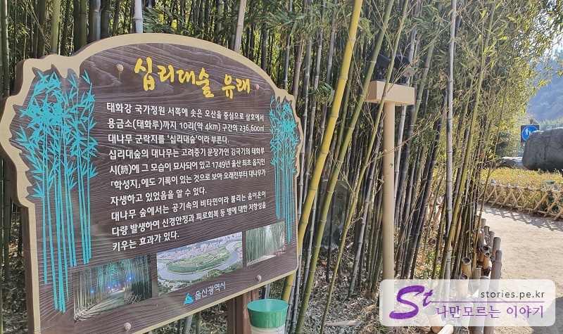 다시 왔던 길을 되돌아와서 은하수 다리를 건너면 국가정원쪽에 십리대숲을 만날 수 있습니다. 십리대숲은 대나무숲이 십리거리로 이어져있다고 해서 붙혀진 이름이라고 하네요.