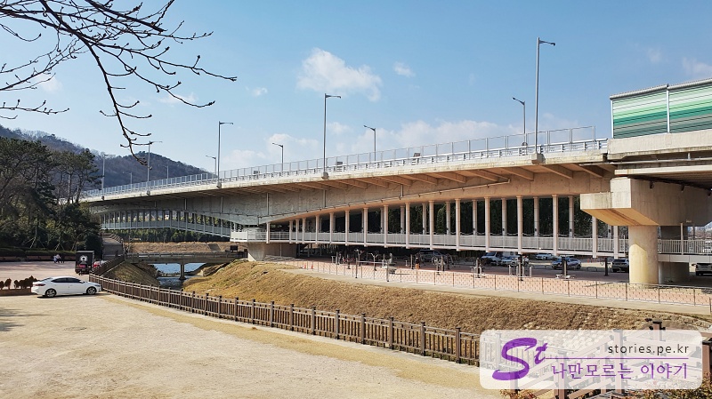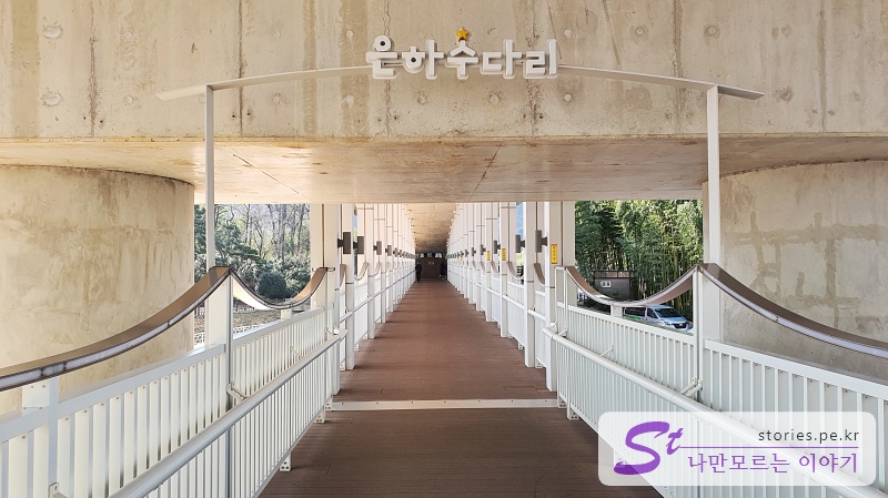 먼저 은하수 다리를 건너기로 했습니다. 은하수 다리는 차들이 쌩쌩 달리는 국가 정원교의 아래쪽에 사람이 다닐 수 있게 만들어 놓은 다리입니다.