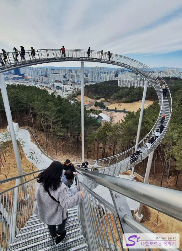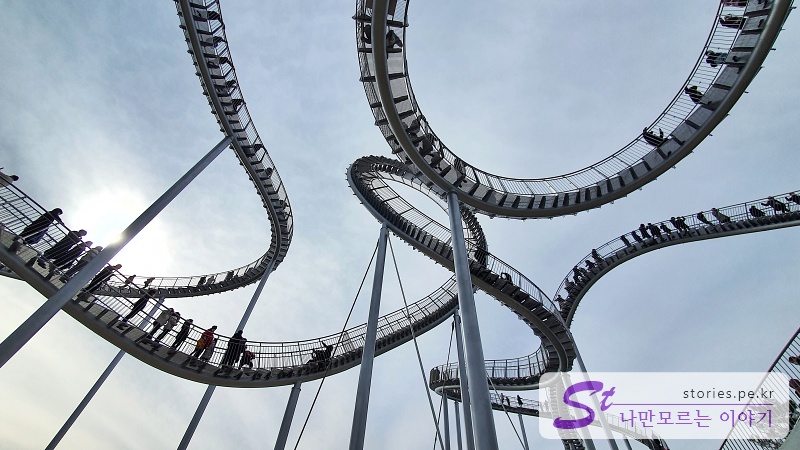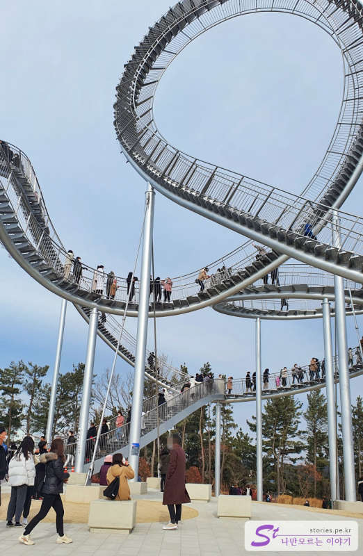 포스코가 포항시에 기증을 했다고 하는데 포항시는 관광객이 늘어서 좋고 포스코는 포스코를 널리 알릴 수 있어서 서로 윈윈하는 거래가 아닌가 합니다. 포스코가 독일에 있는 '타이거 앤드 터틀 매직 마운틴(Tiger & Turtle - Magic Mountain)'을 제작한 작가에게 의뢰하여 만들었다고 하네요. 풍속과 어느 정도의 지진에도 견딜 수 있게 설계했다고 하니 안전하겠지요? 이 스페이스 워크는 바람이 기준치 이상 세게 불거나 제한 인원이 넘어서면 통제를 한다고 하네요. 최소한의 안전은 지키면서 운영하는 것 같아요.