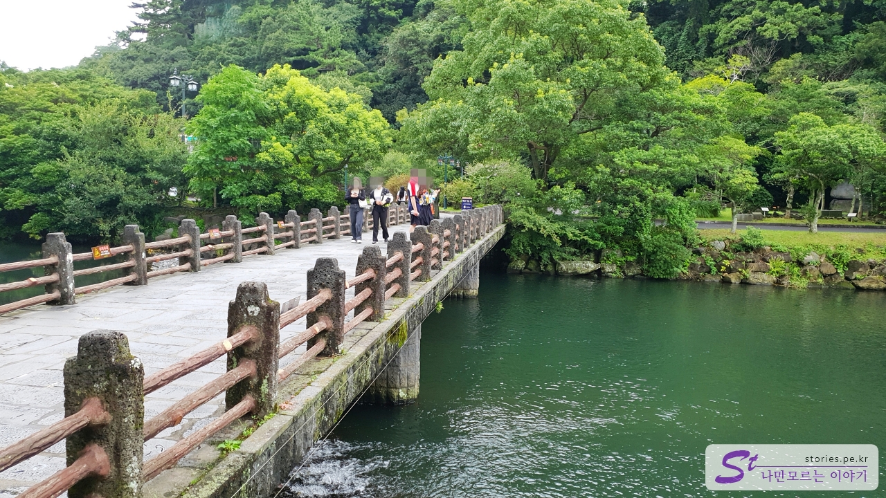 50m쯤 가다 보면 물허벅을 매고 있는 석상이 있는 다리가 나옵니다. 이 다리를 건너면 천지연폭포로 갈 수 있습니다.