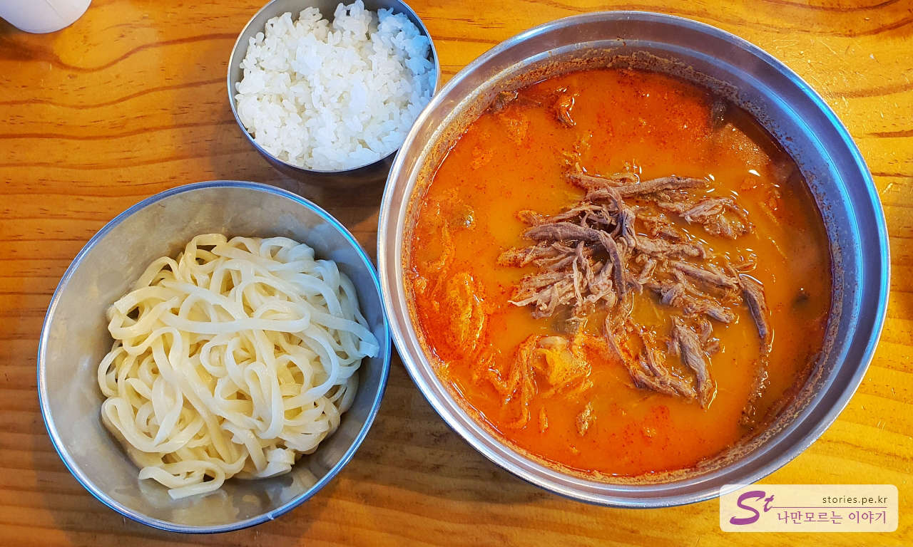먼저 육개장에 칼국수를 넣고 말아서 먹습니다. 먹고 난 후에 밥을 말아먹을 수 있습니다.