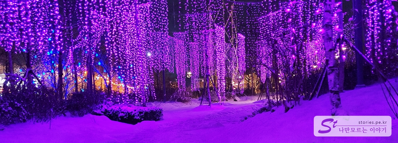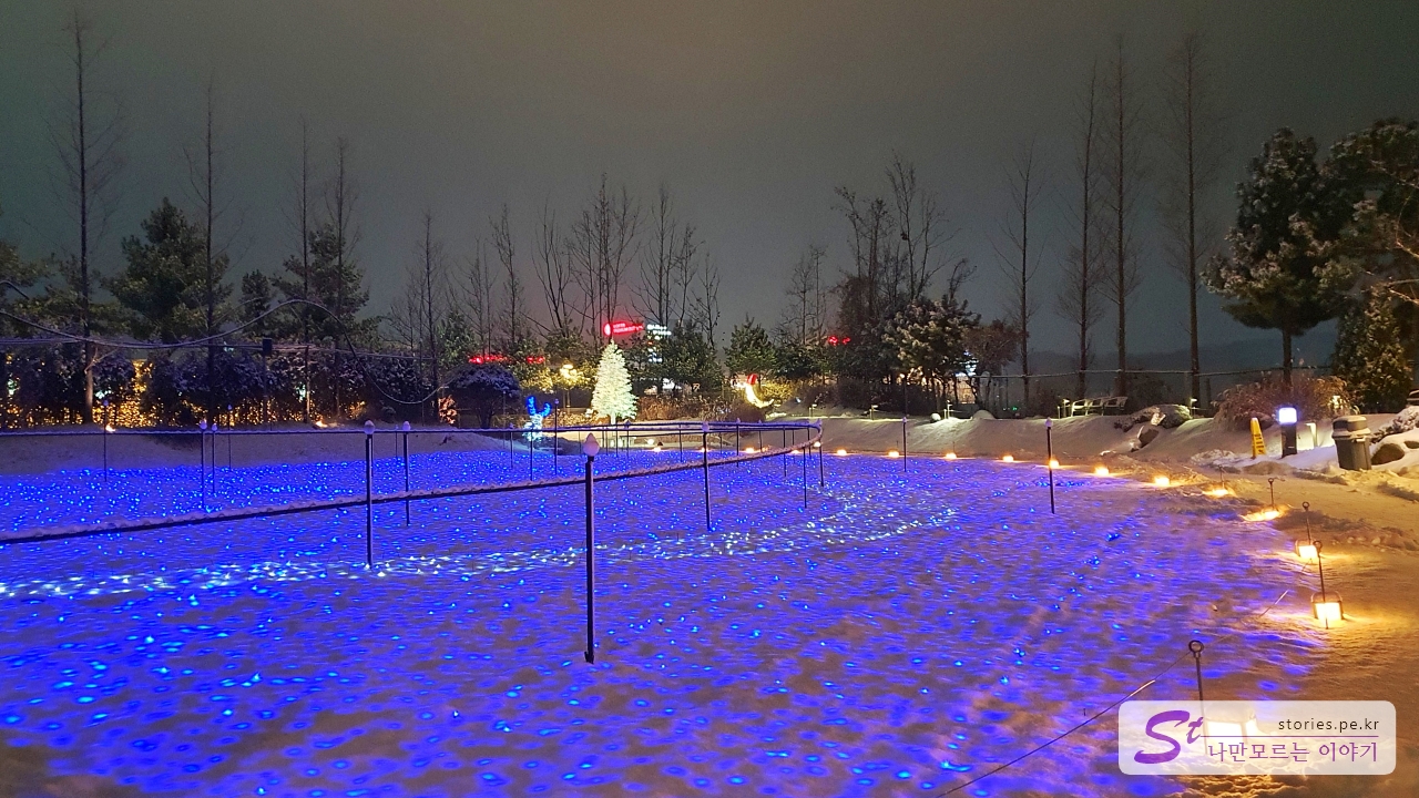 조금 걷다 보면 불빛 호수를 볼 수 있습니다. 조명을 바닥에 깔아서 움직이는 조명을 만들어 놨습니다. 그 위에 살짝 눈이 덮여있어서 눈에 반사된 조명으로 멋진 모습이 연출되었습니다.