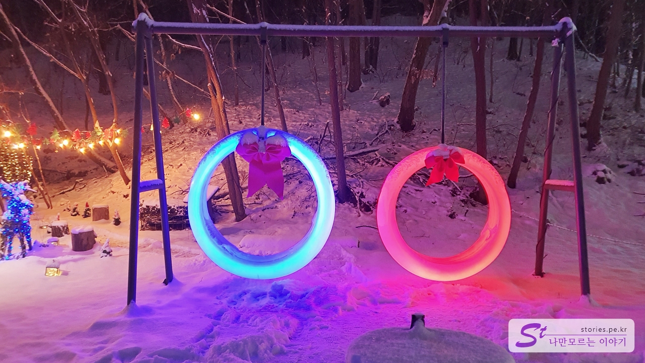 불빛 그네입니다. 어느 정도의 무게는 견뎌내는 것 같은데, 어른이나 몸무게가 많이 나가는 사람은 조금 불안하더라고요. 하지만 뭐.. 이게 그네 타라고 만들었다기보다는 사진 찍으라고 만들어 놓은 것이라 사진만 좀 찍고 나오시면 됩니다. ㅎㅎ
