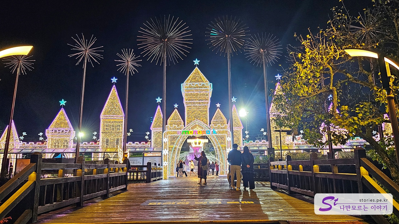 루미나리에 불빛에 이끌리어 저희도 피곤하지만 어쩔 수 없니 내려가 봤습니다. 드래곤밸리호텔에서 바로 편하게 나갈 수 있는 통로가 있었습니다.