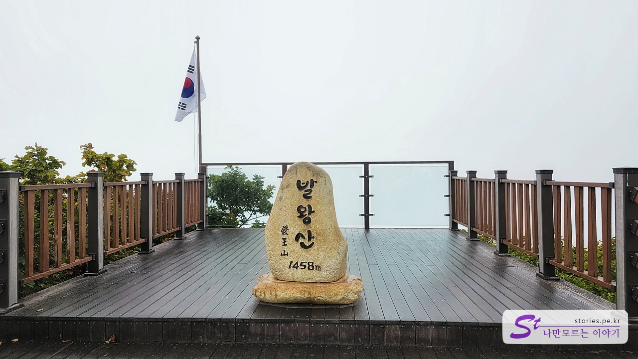 그리고 바로 옆에 1458m라고 적혀있는 발왕산 정상 비석이 서 있습니다.