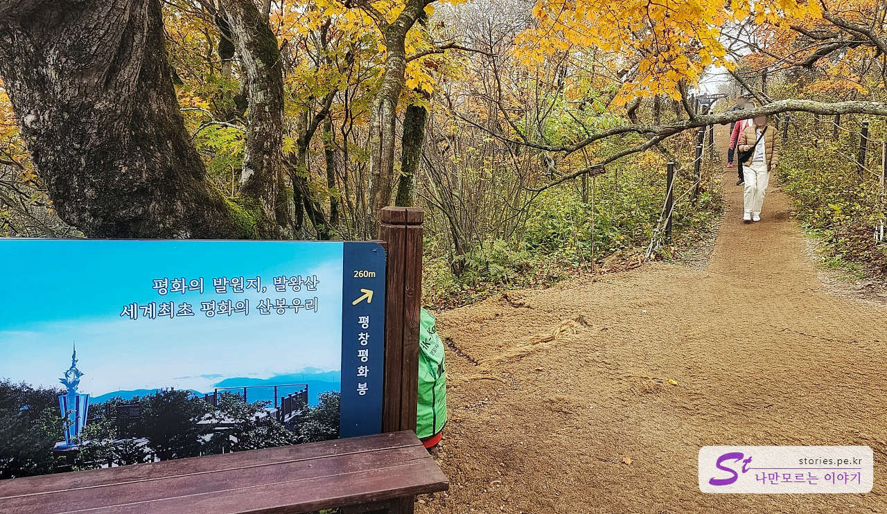 한 5분쯤 들어가면 겸손의 나무 앞에 발왕산 정상에 있는 평창평화봉으로 길이 안내되어 있습니다. 여기는 비포장도로이기 하나 그렇게 어렵지는 않습니다. 그리 멀지 않으니 다녀와도 부담스럽지 않습니다.