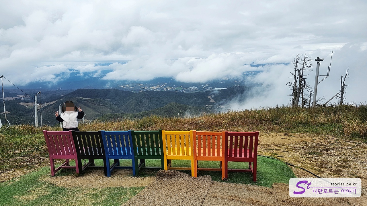 대략 20분 정도 오르면 발왕산 꼭대기에 있는 모나파크에 도착을 합니다. 아래에서는 날씨가 맑았었는데, 아쉽게도 산꼭대기에는 구름이 잔뜩 끼어 있었습니다. 다행히 몇 시간 지나자 다시 날씨가 맑아져서 좋은 풍경은 보고 내려왔네요.