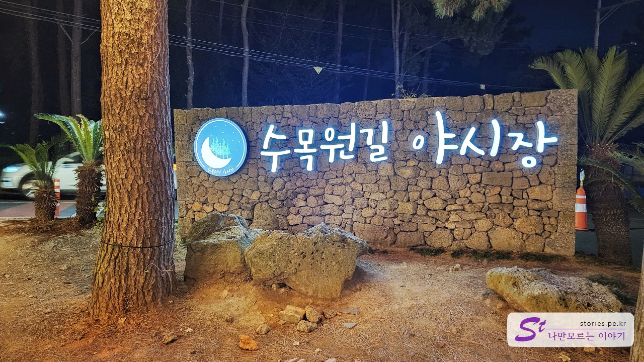늦은 비행기로 제주도에 도착하자 오후 8시 이후의 제한된 활동으로 인해 실망감을 느꼈습니다. 옵션을 찾다가 우연히 수목원길 야시장을 발견했는데, 공항에서 단 10분 거리에 있는 편리하고 접근하기 쉬운 곳이었습니다.
