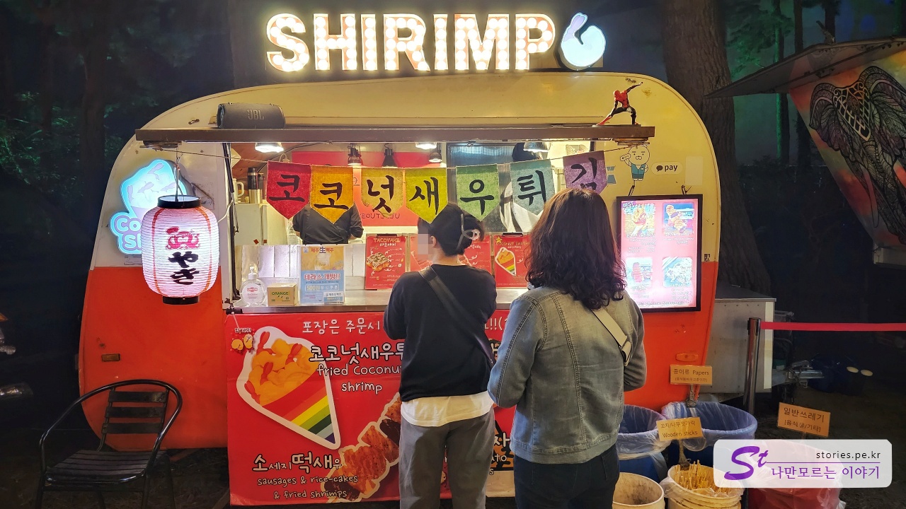 야시장의 음식을 놓치지 않는 것이 좋습니다. 여러 가지 음식을 판매하는 푸드 트럭이 있어요. 흑돼지 강정, 새우튀김, 음료 등이 다양하게 준비돼 있습니다. 가격은 싸지 않고 맛은 그리 좋지 않지만, 야시장의 분위기에서 먹으면 여행 중인 기분이 들어서 좋습니다.