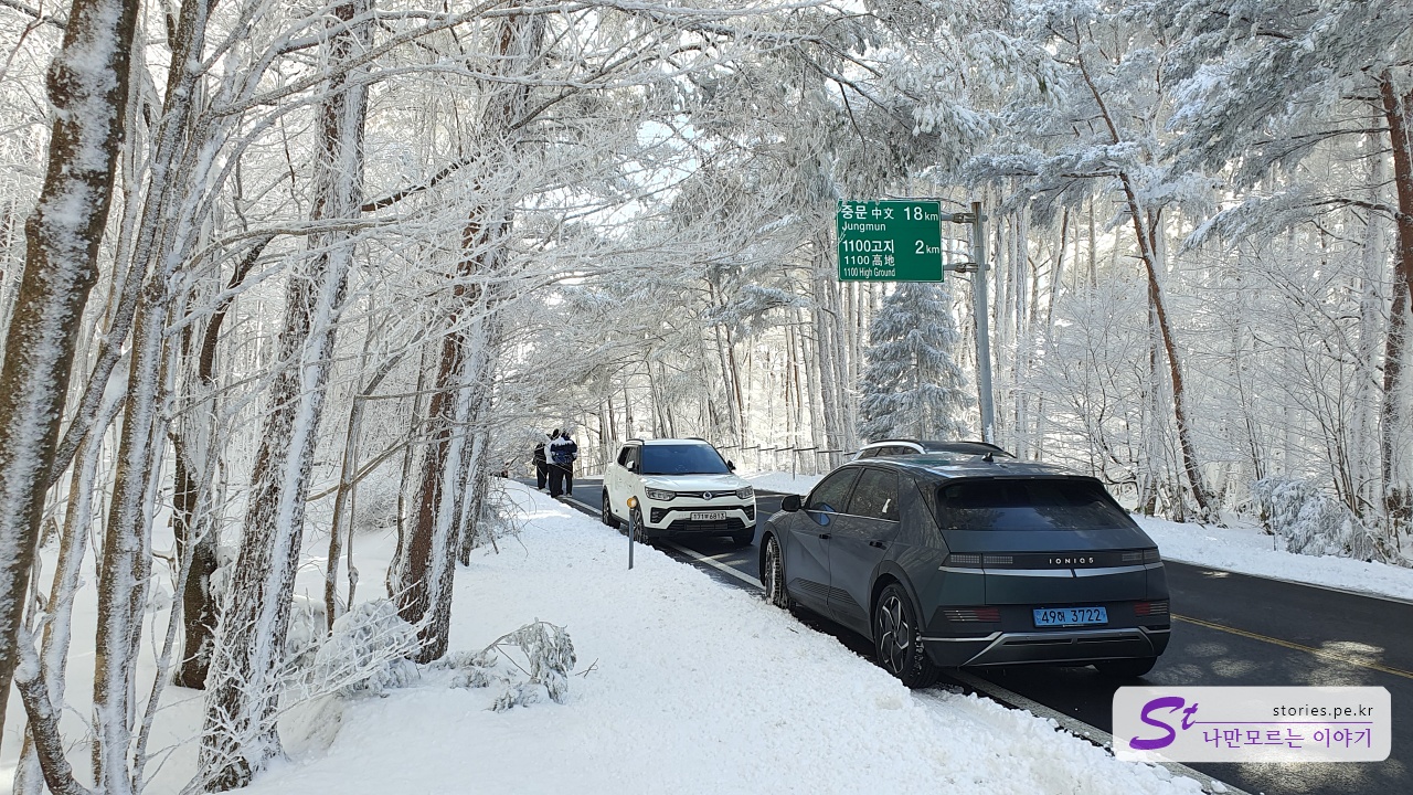오전에 한돈에 예약을 걸어놓고 시간이 남아서 1100고지 습지를 다녀왔습니다. 중문에서 약 30분 정도 소요가 되는 거리입니다. 원래 1100고지는 겨울에 눈이 왔으나 도로가 통제되지 않았을 때 올라가는 길이 정말 압권인 길입니다. 아래 사진 3개는 올해 1월에 눈이 한참 왔을 때 1100고지에서 찍은 사진입니다.