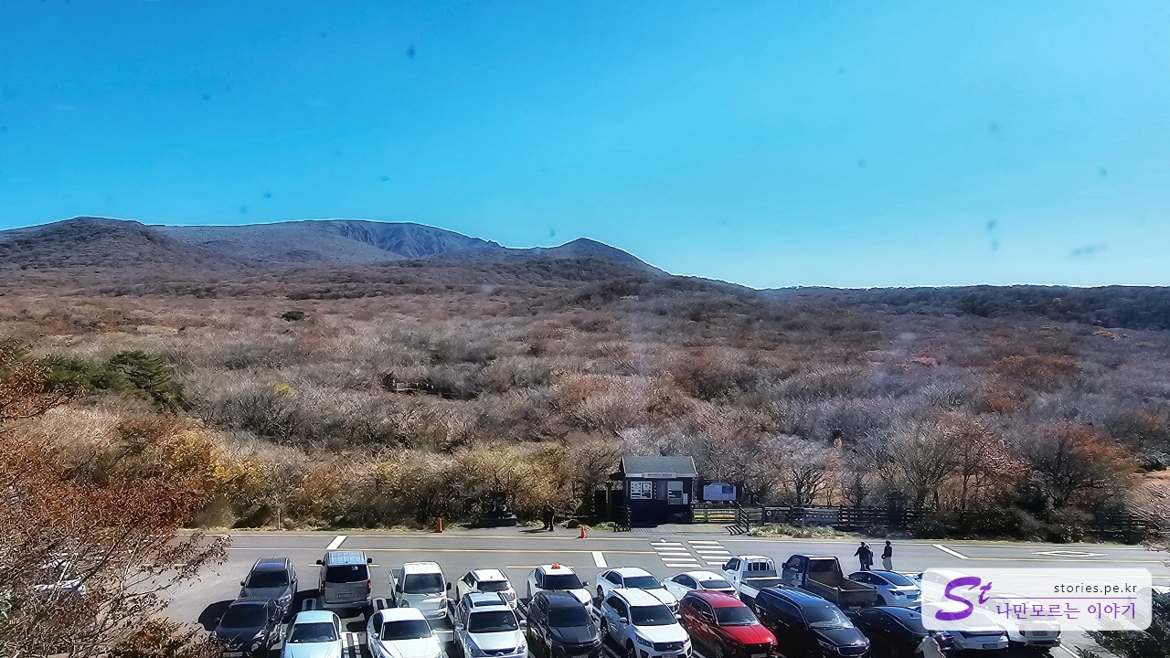 창문을 통해 한라산을 볼 수 있습니다. 습지는 주차장 바깥쪽에 있는 행길을 지나야 가볼 수 있습니다. 방향으로 봐서 한라산의 영실코스 쪽이고 윗세 오름을 볼 수 있습니다.