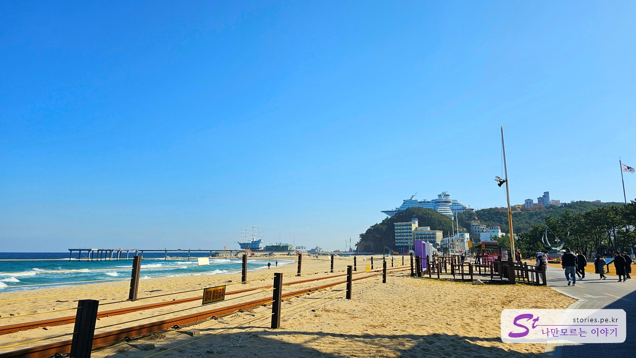 해변의 바로 앞쪽으로 레일바이크가 달릴 수 있는 레일이 깔려있습니다. 저 멀리 배 모양의 썬 크루즈 리조트가 보이네요.