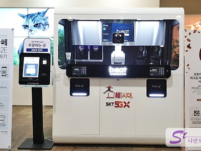 오늘 SKT타워에 일이 있어 방문했다가 신문물을 보게 되었습니다. 바로 로봇카페인데요. 로봇카페 B;eat 2E 사용기 매스컴을 통해서는 여러번 들어봤지만 실제로 보게된 것은 저도 오늘이 처음입니다. 신기하기도 하고 가격도 비싸지 않아서 한번 시도해 봤습니다. 컨테이너 중간에 있는 로봇팔이 바리스터 입니다. 팔에 화면이 달려있고 눈모양으로 어느정도 감정을 표시합니다. 주문은 키오스크로 합니다. 여기만 가격이 저렴한 건진 모르겠지만 아이스아메리카노가 1,000원입니다. 앱으로 주문도 가능한것 같긴 한데 저는 스마트폰에 있는 삼성페이로 신용카드 결제를 했습니다. 결제가 정상적으로 완료되면 주문표가 발행이 됩니다. 주문표에는 주문번호와 픽업번호가 있습니다. 주문과 동시에 로봇 바리스타가 아래 동영상처럼 커피를..