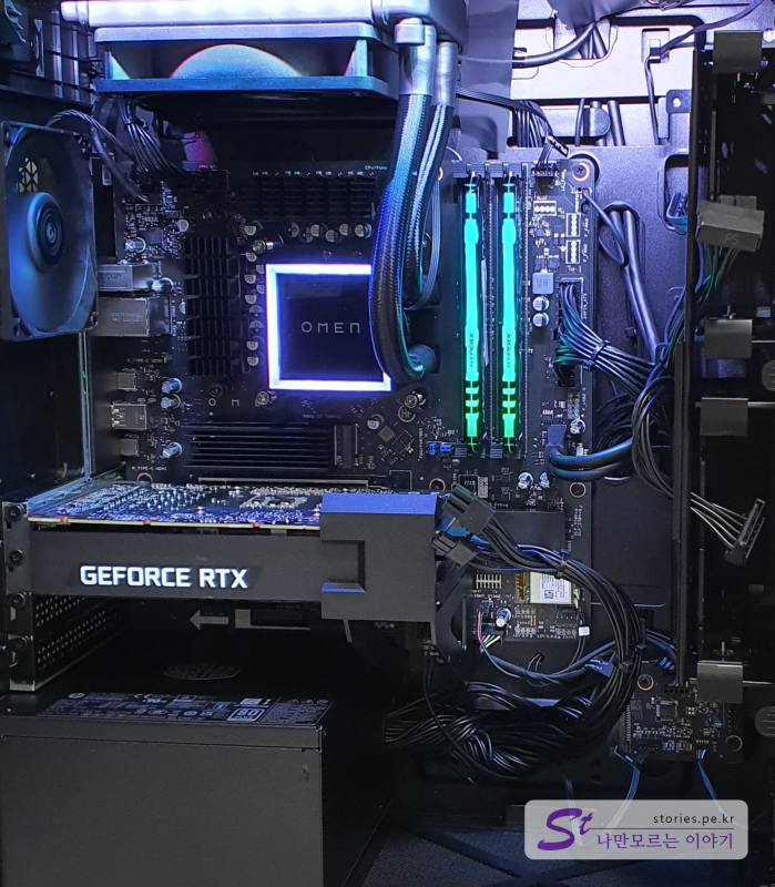 HP OMEN GT12-1002KR는 라이젠 5800X CPU를 기반으로 엔비디아 RTX3060을 달고 있습니다. 또한 쿨러마스터의 수랭쿨러를 달고 있어서 발열도 충분히 잡아주고 있습니다. 배선도 깔끔하게 정리되어 있어서 공기흐름에 방해를 최소화 했고 한쪽면을 투명유리로 처리해서 내부를 볼 수 있게 되어 있습니다. 내부도 화려한 조명으로인해 이 PC가 게이밍PC라는 것을 한껏 뿜어내고 있습니다.