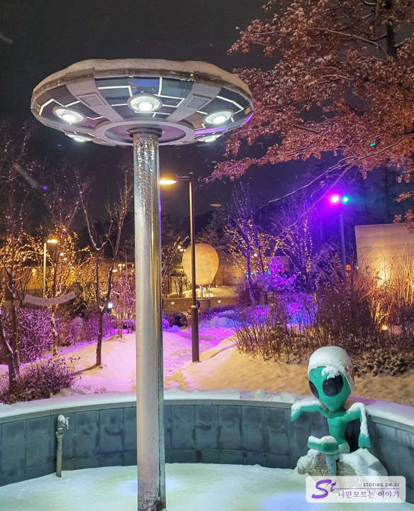 외계인도 만나볼 수 있습니다. 사우나를 하러 온 것 같은데, 눈을 맞고 있네요.