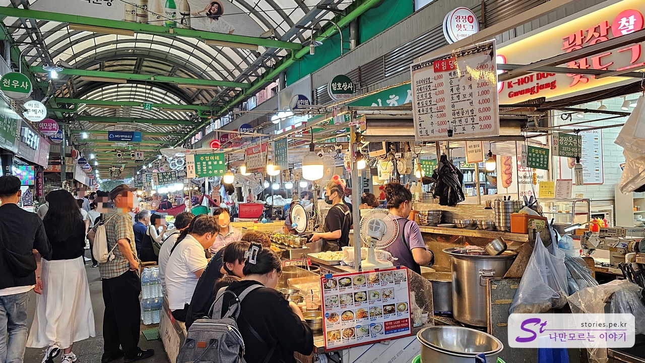 광장시장의 가장 중앙에 위치한 박가네 빈대떡 골목에 도착했어요. 여기는 빈대떡, 육회비빔밥, 마약김밥으로 유명한 곳이에요.