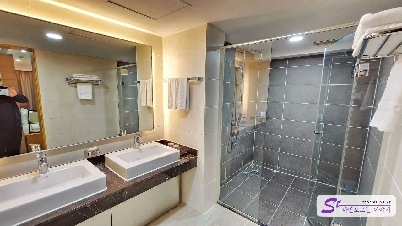1개만 있어도 될 세면대가 쓸데없이 2개나 있을 정도로 욕실이 상당히 넓었습니다. 수건도 2명이 2일 동안 충분히 쓸 수 있게 비치가 되어 있었구요.
